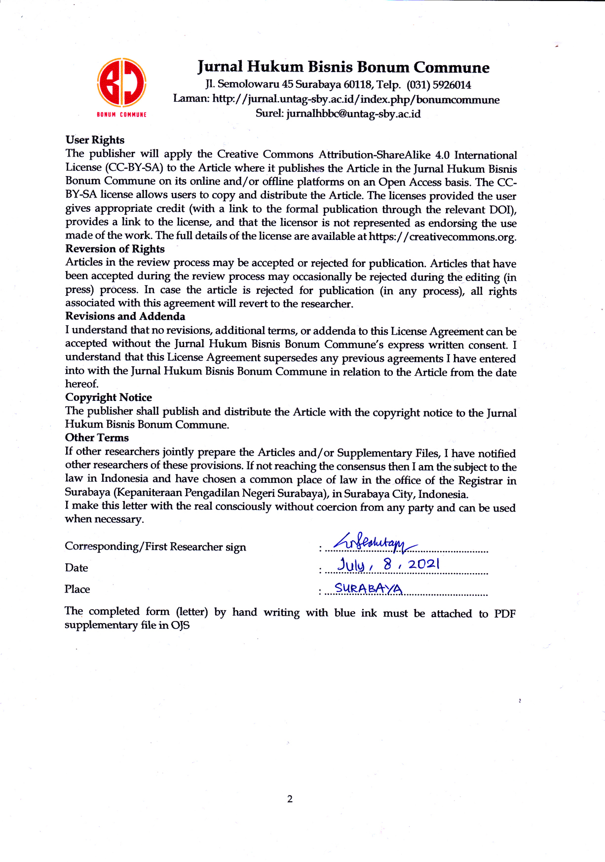 Authors who publish with Jurnal Hukum Bisnis Bonum Commune agree to the following terms: