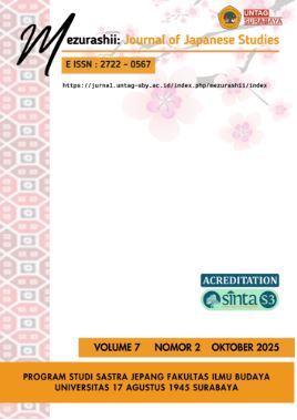 Mezurashii: Journal of Japanese Studies is a biannual peer-reviewed, open-access journal published by the Faculty of Cultural Science, University of 17 Agustus 1945 Surabaya. The journal encourages original articles on various issues within Japanese Studies, which include but are not limited to linguistics, literature, and culture. Mezurashii: Journal of Japanese Studies accepts to publish a balanced composition of high-quality theoretical or empirical research articles, comparative studies, case studies, review papers, exploratory papers, and book reviews. All accepted manuscripts will be published in online journal.