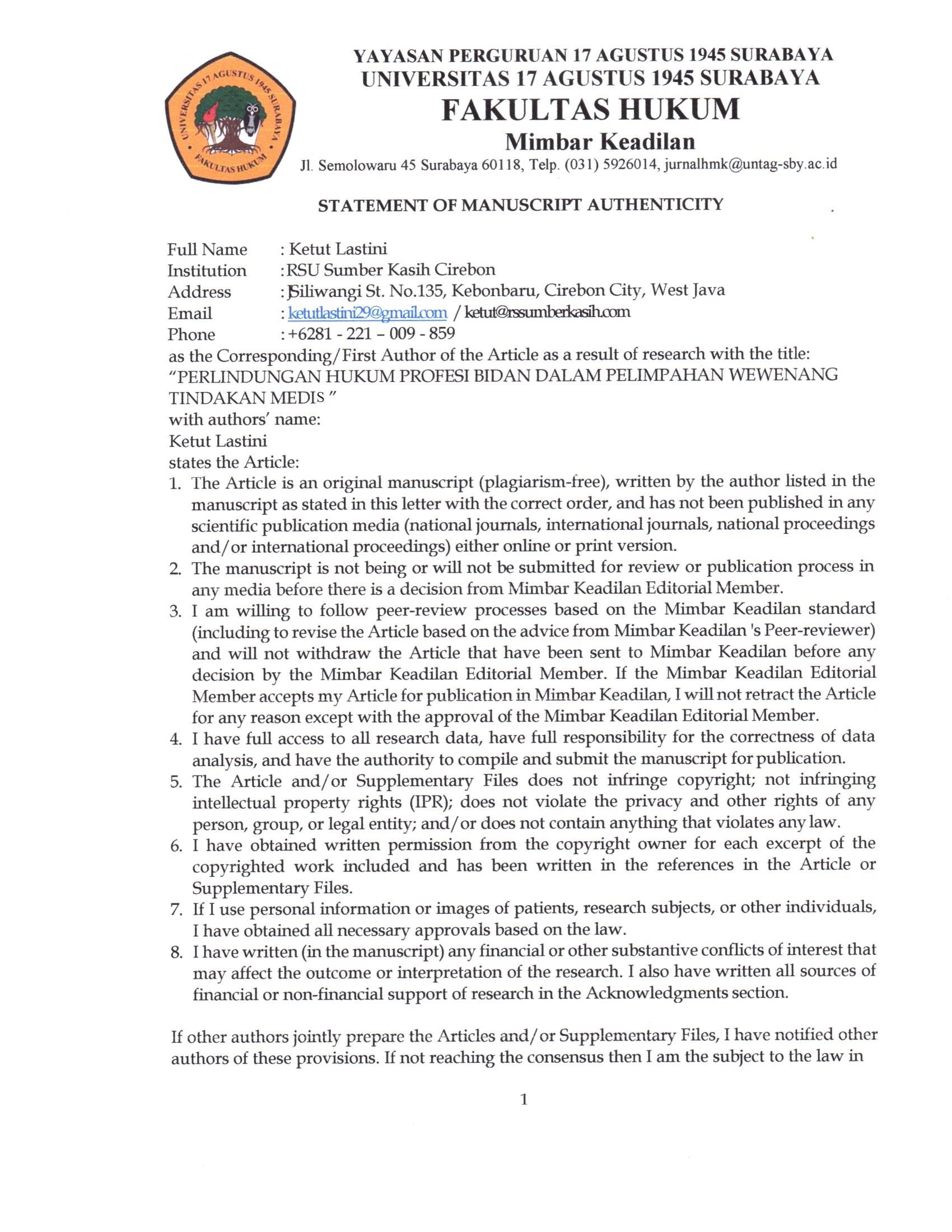 Rahmawati, Vita, ‘TANGGUNG JAWAB HUKUM RUMAH SAKlT DAN ASAS MANFA-AT’, KISI HUKUM (Artikel Magister), 2010.